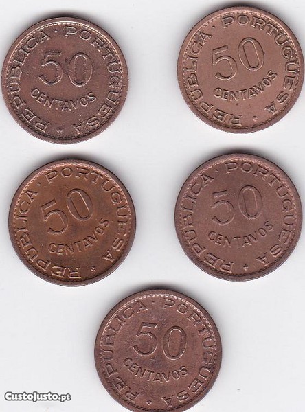 Vendo excelente colecção de moedas de $50 centavos bronze, da ex. colónia portuguesa de Angola, dos anos; 1953 1954, 1957,1958,1961 , muito bem conservadas, veja as fotos.