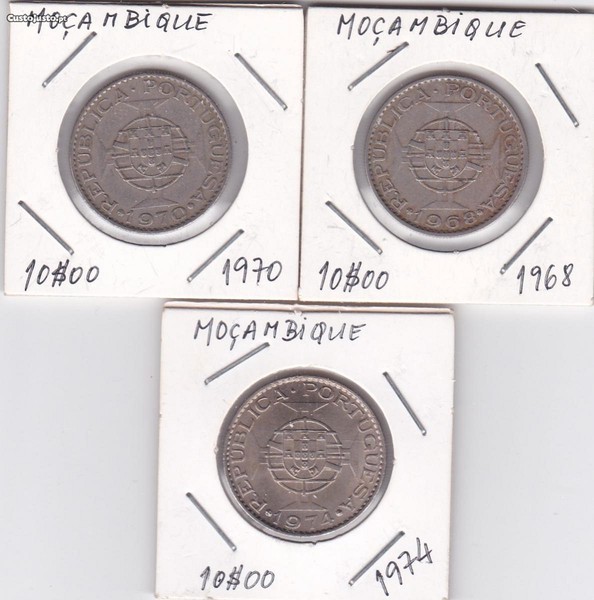 Vendo excelente lote de 3 moedas de 10$00, da ex. colónia da Moçambique, dos anos; 1968; 1970; 1974, no estado de BC.