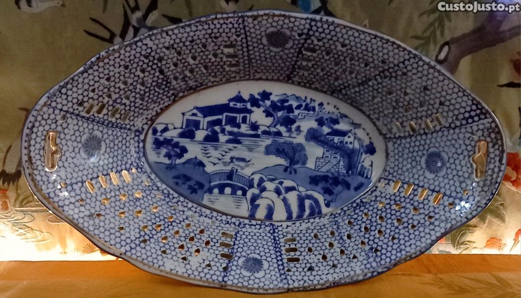 Preço: 65 €Disponível, Bonita e Antiga Taça de Frutos em Porcelana Asiática, peça Rendilhada,