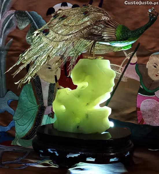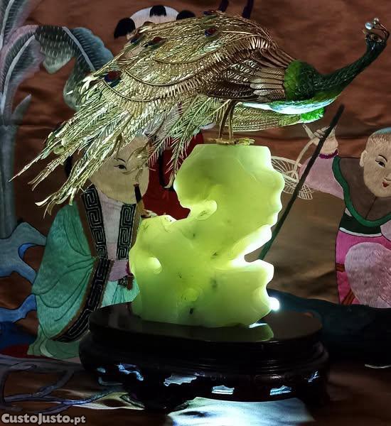 Disponível, Bonita escultura Vintage Chinesa, Peça em Cloisonné, Jade, e Filagrana Banhada Ouro, com Base Esculpida em madeira Nobre. Peça encontra-se em muito bom estado. mede. 32,cm,x,30,cm,x,18,cm. Peça pesada.