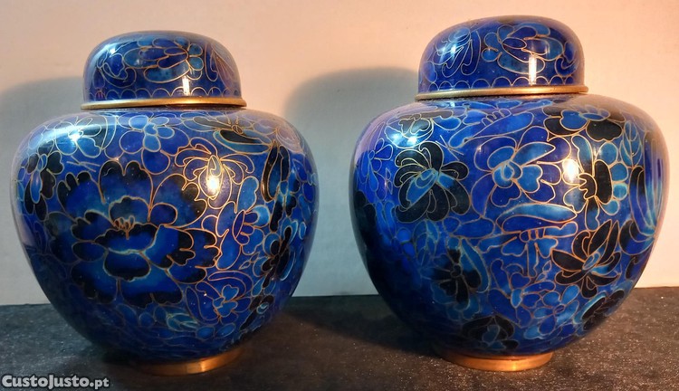 Disponível. Bonito e Antigo Par De Potes Chineses, sec.xix, principio sec.xx. peças em Bronze Cloisonné, encontran-se em muito bom estado. 15mcm,alt.