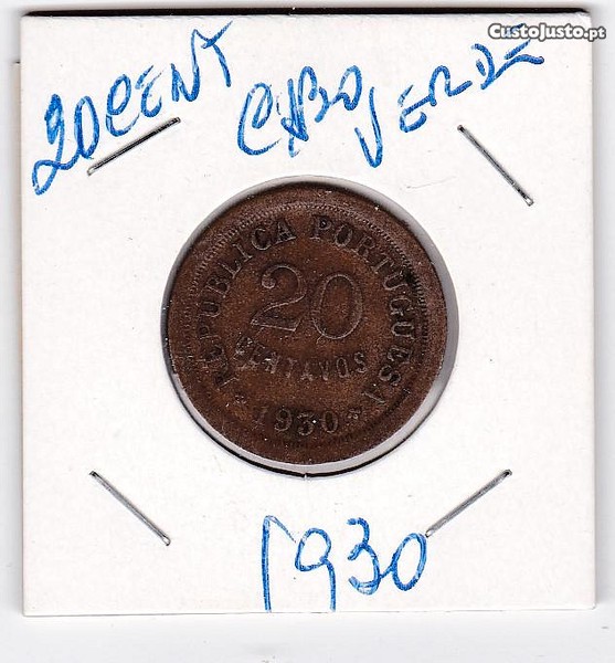Vendo excelente moeda de $20 centavos de Cabo Verde, de 1930, bem conservada, veja as fotos.