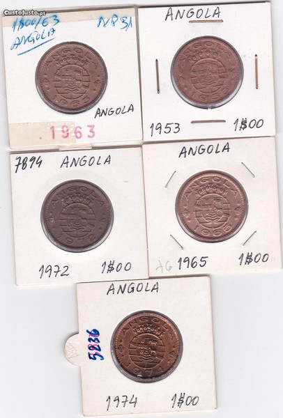 Vendo excelente colecção de moedas de 1$00 em bronze, da ex. colónia portuguesa de Angola, dos anos;1953; 1963; 1965; 1972; 1974, muito bem conservadas, veja as fotos.