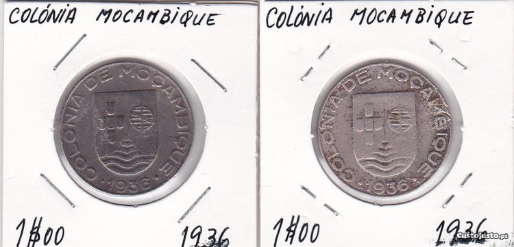 Vendo 2 excelentes moedas de 1$00, em cuproniquel, da ex. colónia portuguesa de Moçambique, de 1936, bem conservadas, veja as fotos.