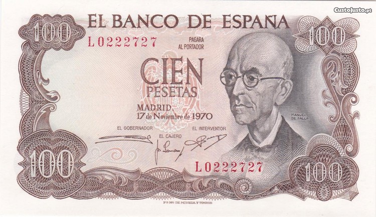 Vendo excelente nota nova de 100 pesetas de 17 Novembro 1970 de Manuel de Falla.