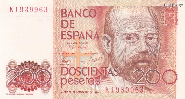 Vendo nota de 200 pesetas, n. K1939963, de Leopoldo Alas Clarin, datada de 16 de Setembro de 1980, bem conservada, veja as fotos.