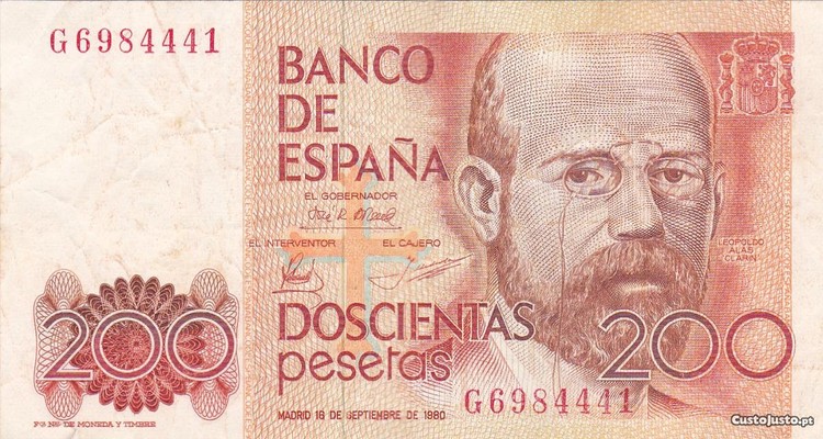 Vendo nota de 200 pesetas, n. G6984441, de Leopoldo Alas Clarin, datada de 16 de Setembro de 1980, bem conservada, veja as fotos.