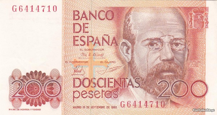 Vendo nota de 200 pesetas, n. G6414710, de Leopoldo Alas Clarin, datada de 16 de Setembro de 1980, bem conservada, veja as fotos.