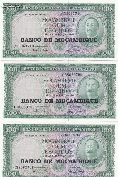 Vendo excelente lote de 8 notas, novas, de 100$00 de Moçambique, datadas de 27 de Março 1961, de Aires de Ornelas, com números seguidos, n.s C 38063701; C 38063702; C 38063703; C 38063704; C 38063705; C 38063706; C 38063707; C 38063708, nunca circularam.
