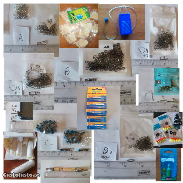 Vários tipos de acessórios de pesca, de acordo com as letras nas fotos:
