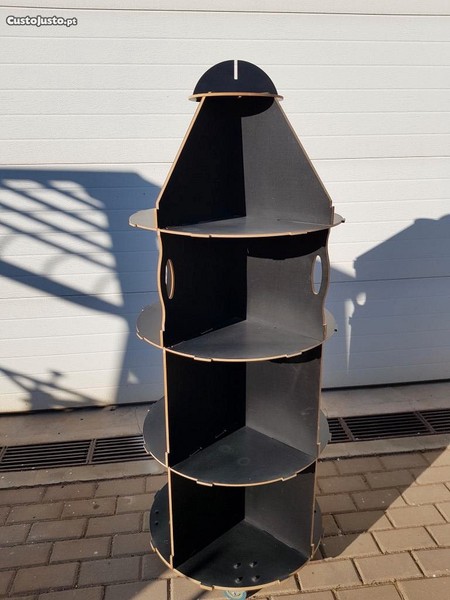 Expositor preto redondo com prateleiras e rodas, feito em MDF laminado. Altura 1.41M Diâmetro 60cm Com rodas Posso enviar por transportadora para todo o pais (desmontado).