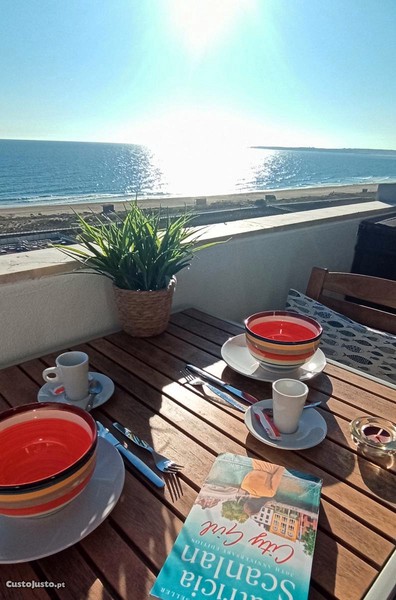 Grande varanda com vista total de mar, com cadeiras, mesa, guarda-sol etc.
