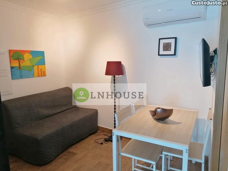 Apartamento no 1º andar sem elevador, composto por um quarto com cama de casal, sala com sofá-cama (140x188), casa de banho, cozinha e uma varanda.