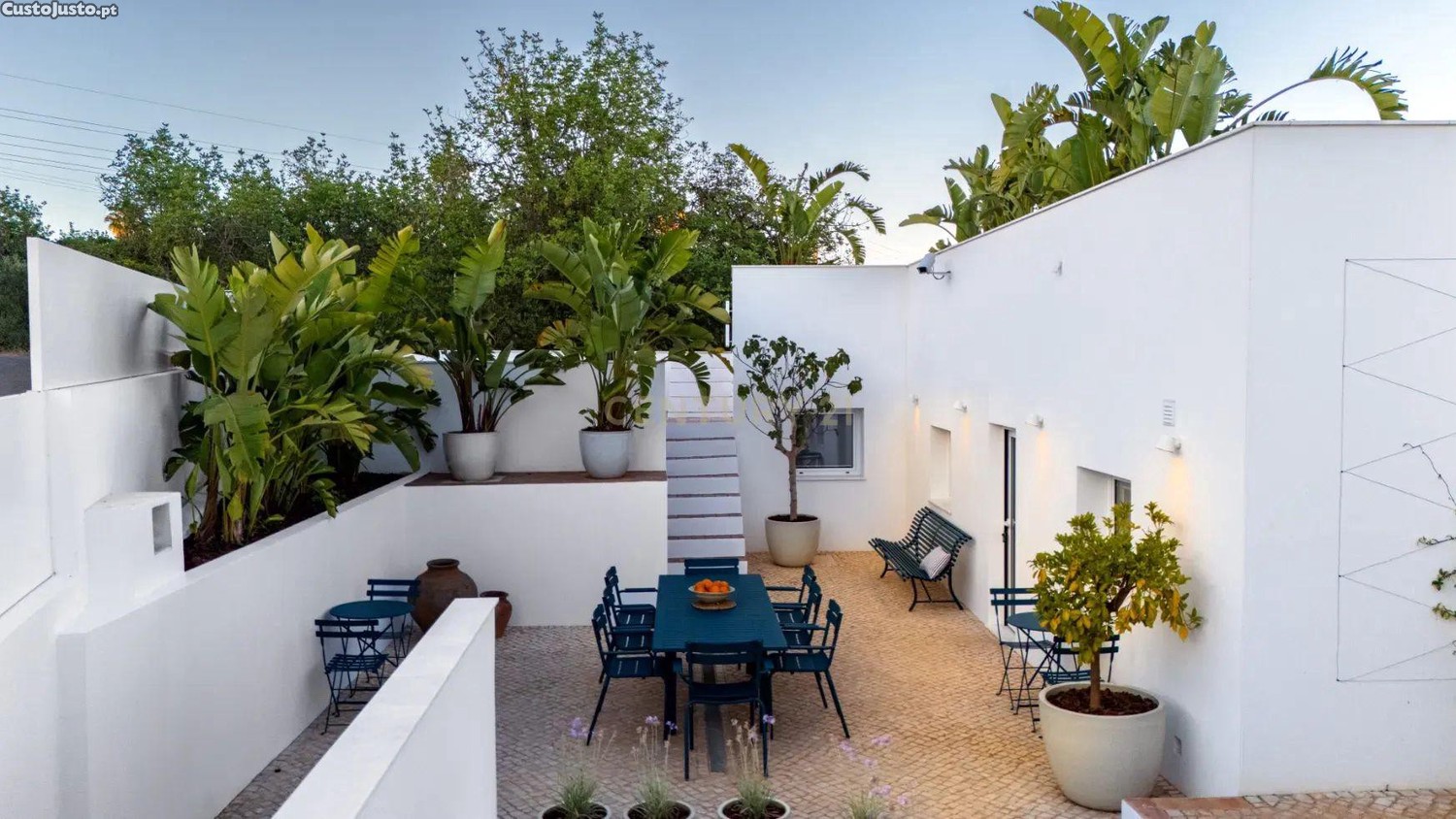 Ao entrar na propriedade, você imediatamente é capturado pela atmosfera serena e mediterrânea, com paredes brancas, terraços de calçada Portuguesa, palmeiras e um plunge pool. A propriedade está vedada, oferece privacidade total e tem vários terraços para desfrutar do bom tempo. Há um portão elétrico que dá acesso ao espaço de estacionamento no próprio terreno.