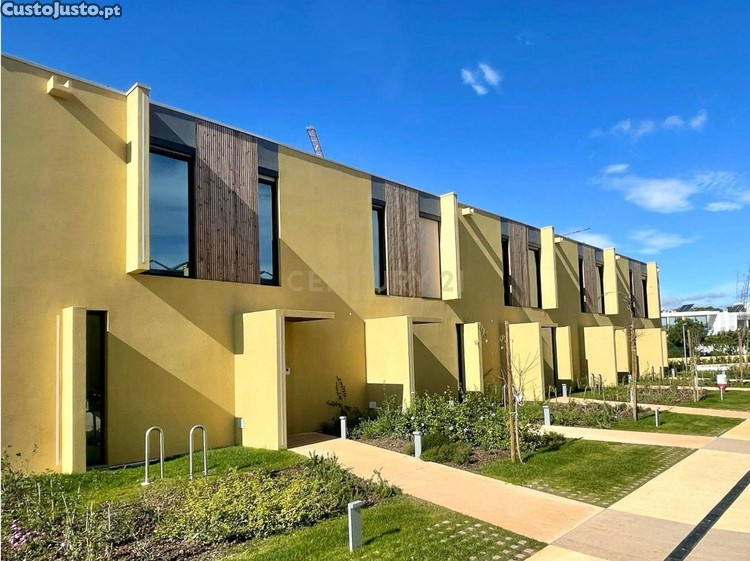 Moradia T3 Nova, em banda, está inserida num condomínio fechado construído em 2024.