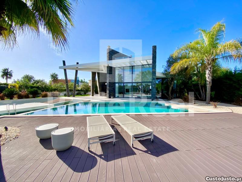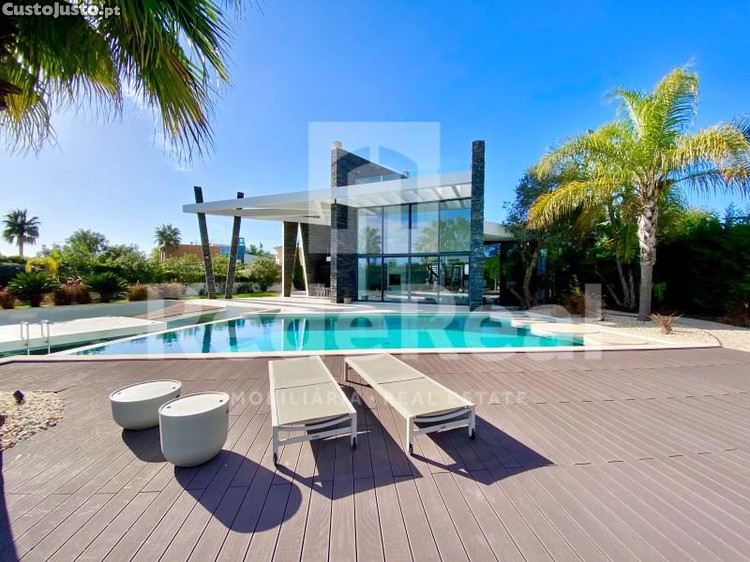 Ao entrarmos no lote, encontramos, desde a entrada, um circuito de água que nos acompanha em toda a extensão, até à entrada principal da casa. Este circuito contorna a casa e entra num dos compartimentos da mesma, sendo visível no seu interior, pelo fato de ter o soalho em vidro. O jardim maduro e com um estilo tropical foi concebido com o propósito de nos proporcionar uma sensação idílica. Esta sensação é transportada também para a piscina, onde encontramos a piscina principal e ao lado desta encontramos uma segunda piscina com uma plataforma no meio, onde podemos disfrutar nesta o maravilhoso sol do Algarve.
