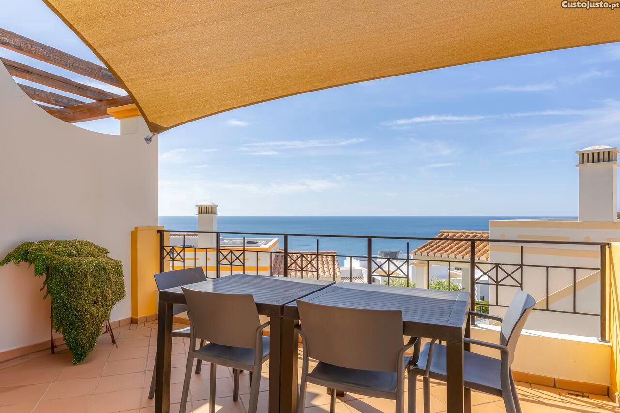 No piso superior, encontra-se uma sala de estar e jantar ampla e luminosa, com acesso a uma varanda espaçosa e elegante, equipada com tons oz para maior conforto e proteção solar. A cozinha moderna, totalmente equipada, também dá acesso direto a um terraço privado e ao jardim, ideal para momentos de descontração. Ainda neste piso, há uma pequena casa de banho conveniente para convidados. Na varanda há uma escada em espiral que conduz ao terraço na cobertura, onde se pode desfrutar de vistas deslumbrantes para o oceano.