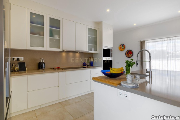 A cozinha moderna e totalmente equipada com eletrodomésticos de alta qualidade, conta com uma ilha central com muito espaço de arrumação, perfeita para os amantes da culinária.