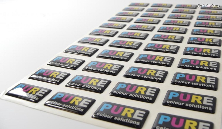 Produzimos para qualquer tipo de utilização, decorativa, publicidade, informativa, industrial, etc., autocolantes em gota de resina cristalina (vitrificados) com resina flexível ou dura e a espessura total é de 2,00mm a 2,5mm.