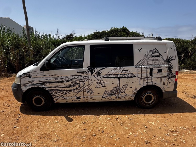 Vendo a minha carrinha VW T5 Transporter de 2007 convertida em Camper Van, de cor branca com uma pintura artística única.