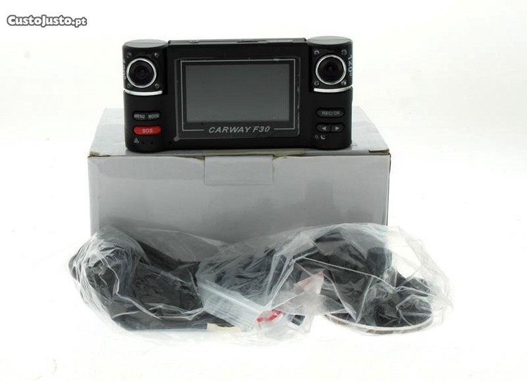 Gravador de imagens Carway F30, nunca usado com sensor CMOS, de câmara dupla, traseira e dianteira, resolução de vídeo 1280x480 e 640x240, com microfone, altifalante e bateria de lítio recarregável incorporada de 3,7V/600mAh, com porta e carregador USB2.0 de isqueiro, moldura de fixação com ventosa e cabo de ligação. Com manual de instruções. Dim: 6,5x13,5x2,5 cm.