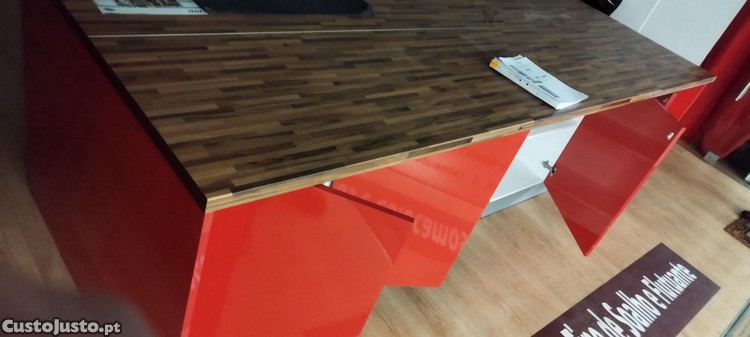 Bancada termo-laminada de cor vermelha e branca, tampo em laminado castanho com 3,04x0,60 com 6 portas de cor vermelha. Móvel semi-montado. Oportunidade.