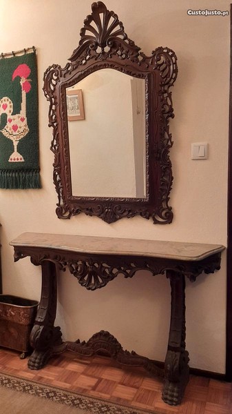 Credência antiga, com espelho muito bonita, em talha de madeira, muito trabalhada, com tampo em mármore em tons de cinzento e beje