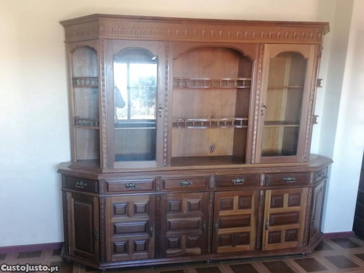 Móvel de sala de estar antigo em madeira mogno, com design clássico e detalhes decorativos. Possui armários e prateleiras para armazenamento, ideal para complementar a decoração de uma sala de estar acolhedora e elegante.