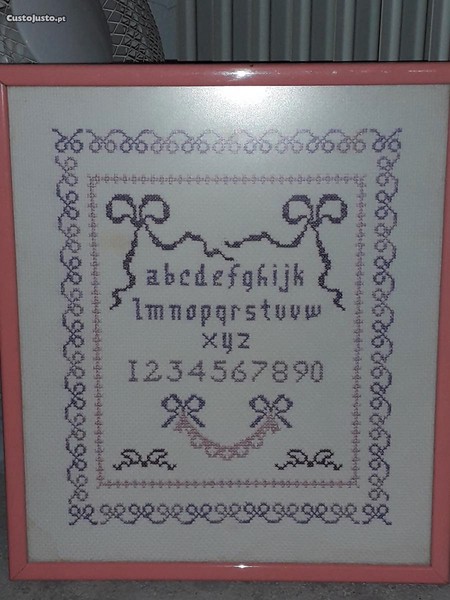 Quadro em ponto cruz, com moldura rosa, com alfabeto. Medidas: 32 x 36 cm. Moldura pode ser alterada. Preço Negociável. Não se aceita pagamento MyBay ou do gênero e o transporte é por conta do comprador