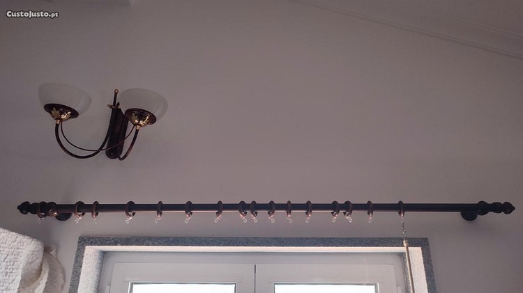 O varão tem 1,50m e segue com os suportes de pregar na parede, as argolas e as extremidades trabalhadas. O material do varão é estilo latão, um metal leve apesar de imitar madeira.