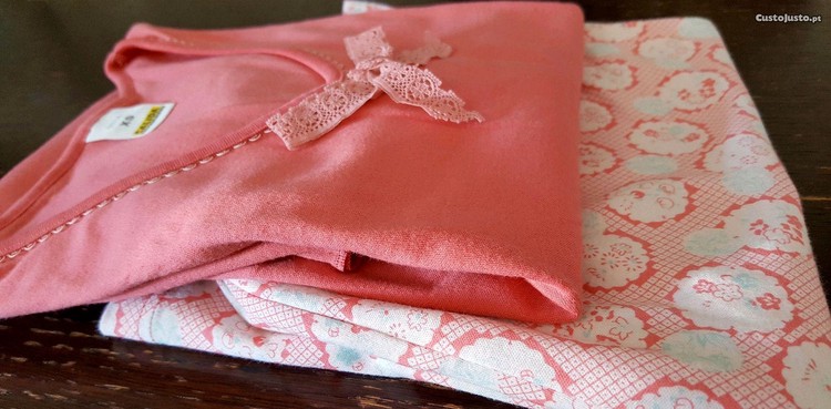 Este romântico Pijama em puro algodão de altíssima qualidade certificado Oeko-Tex, é composto por uns Calções com elástico na cintura e cordão a condizer, e por uma T-Shirt de manga curta, com decote em V e um adorável laço de renda aplicado na frente.