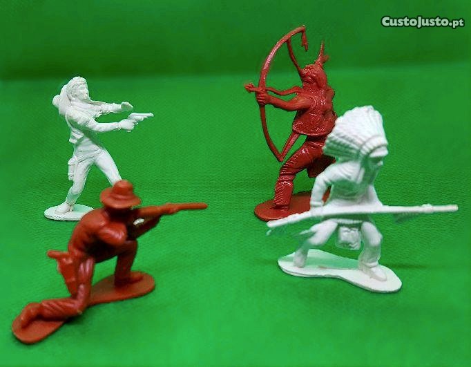 Conjunto de 4 Mini Figuras, composto por 2 Índios e 2 Cowboys em plástico monocromático.
