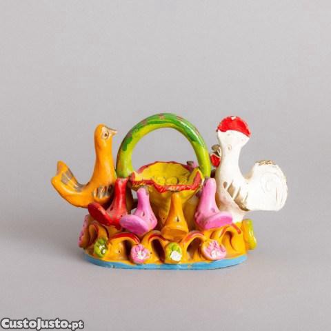 Grupo escultórico em barro pintado, decoração policromada, assinado. Sinais de uso e pequenas falhas.