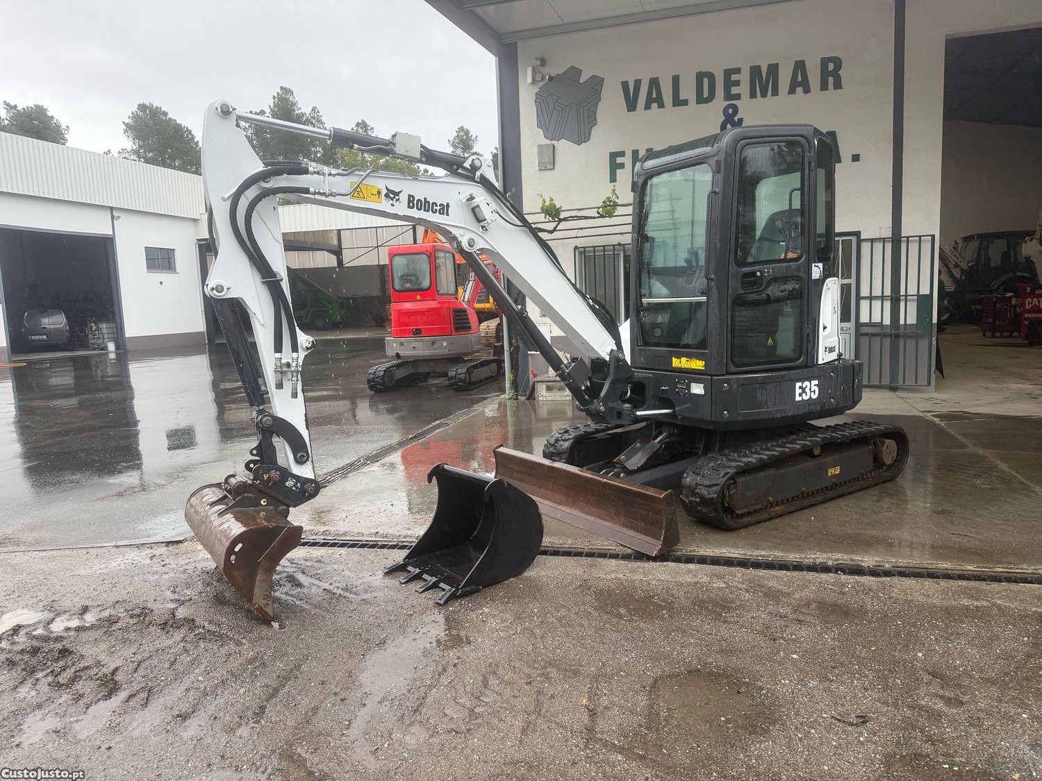 Mini escavadora de marca Bobcat, modelo E35, do ano 2018, com 2497h, equipada com linha de martelo, engate rápido e 2 baldes. Excelente estado.
