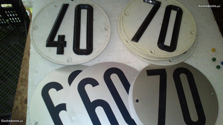 Possuo para venda matriculas, números e chapas de limite velocidade para carros antigos de marcha lenta, tratores etc.Pretas com números e letras brancas em relevo.