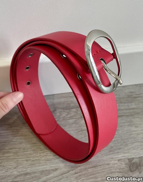 De material semelhante a pele, de cor vermelha. Com fivela oval de metal prateado. Com 7 buracos com rebordo metálico prateado.