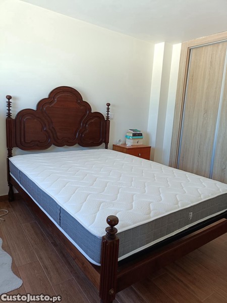 Cama de madeira 140x190 com estrado e colchão + 2 cadeiras.
