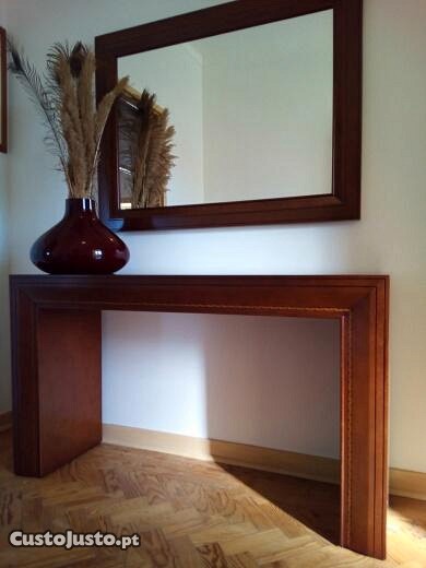 Vendo conjunto de consola e espelho respetivo, de estilo clássico moderno, em madeira maciça de cerejeira, com relevo fino e friso decorativo embutido através da técnica de marchetaria.