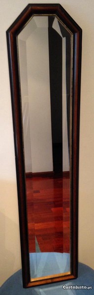 Espelho biselado com moldura em madeira, com ligeiras marcas de uso.
