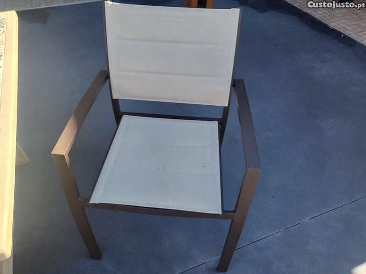 Bela mesa de jardim com 5 cadeiras confortáveis para venda. A mesa e as cadeiras são estáveis e estão em bom estado. No entanto, apresentam alguns pequenos sinais de uso.