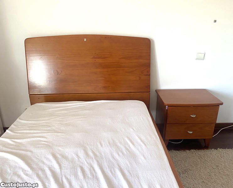 Tem cama com estrado, mesa de cabeceira, espelho, camiseiro com gavetas, guarda roupa de duas portas e duas gavetas, estante e secretária. Tudo em madeira maciça e cantos arredondados