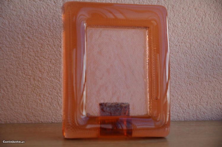 Moldura em vidro pesado (1,7 kg)cor de laranja leve de Marinha Grande.Dimensões : 18 cm de altura, 14,5 cm de largura e 7 cm de espessura. Encontra-se em Leiria(mais portes CTT se necessário).