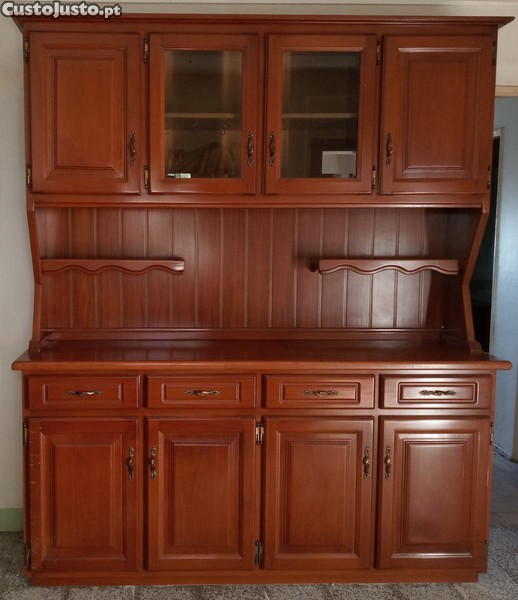 Disponível Imponente Móvel Louceiro de Qualidade com Estrutura de Madeira de Cerejeira com Divisórias internas em Aglomerado Folheadas de Nogueira Composto por Aparador Inferior com 2 Armários Amplos e 4 Gavetas, Módulo Superior Composto por Bancada, Prateleiras Laterais e 2 Armários Tipo Vitrine Amplos com Apliques para Chávenas ou Utensilios;