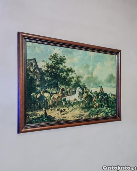 Vende-se este quadro antigo de 78x58 cm, uma bela reprodução rara de uma cena equestre clássica, com cavalos, cães e figuras humanas em um ambiente naturalista.