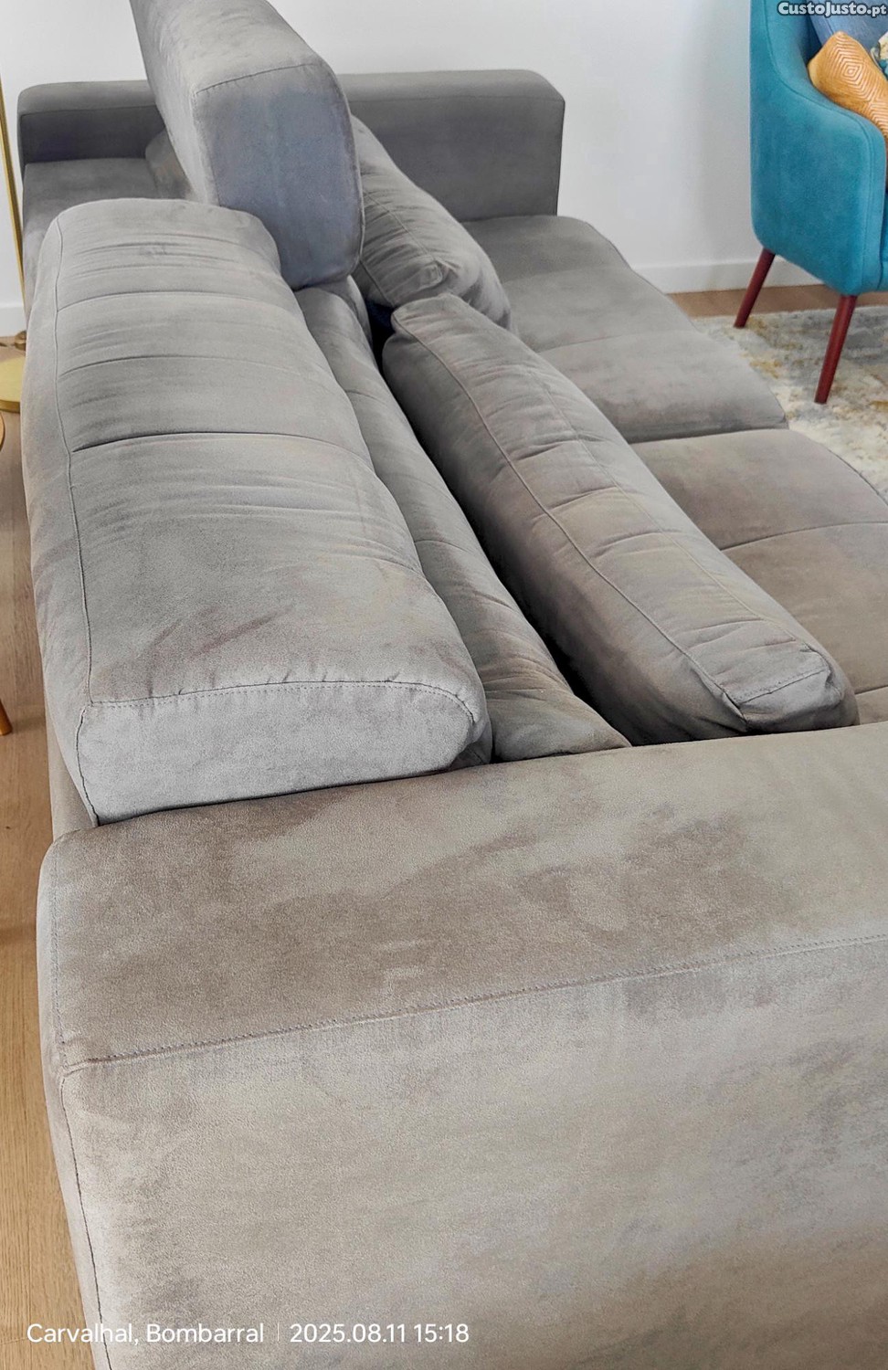 Sofá usado em excelente estado, com 2 chaise retráteis, encosto de cabeça regulável. Cinza médio, tecido sintético impermeável, com toque suave.