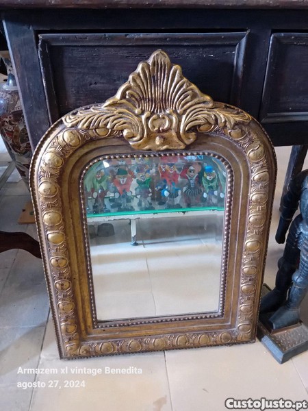 Um espelho em madeira pintado a dourado. Bom estado e mede 68 cm por 47 cm