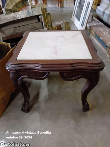 Uma mesa de centro com pedra estilo marmore. bom estado e mede de tampo 49 cm por 49 cm e de altura 42 cm