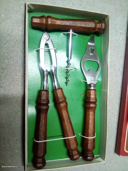 Varios items que ficam bem numa cozinha. 1 conjunto para abrir garrafas vinho, cerveja e quebra nozes. 1 bandeja +-22cm para doces, bolos ou algo do gênero. 2 facas de queijo. 1 porta ovos, para pôr por cima de um frigorifico ou bancada (com ovos). 1 conjunto de muita boa qualidade para aquecer bebida alcoólica, quando não se usa, tem um efeito decorativo.