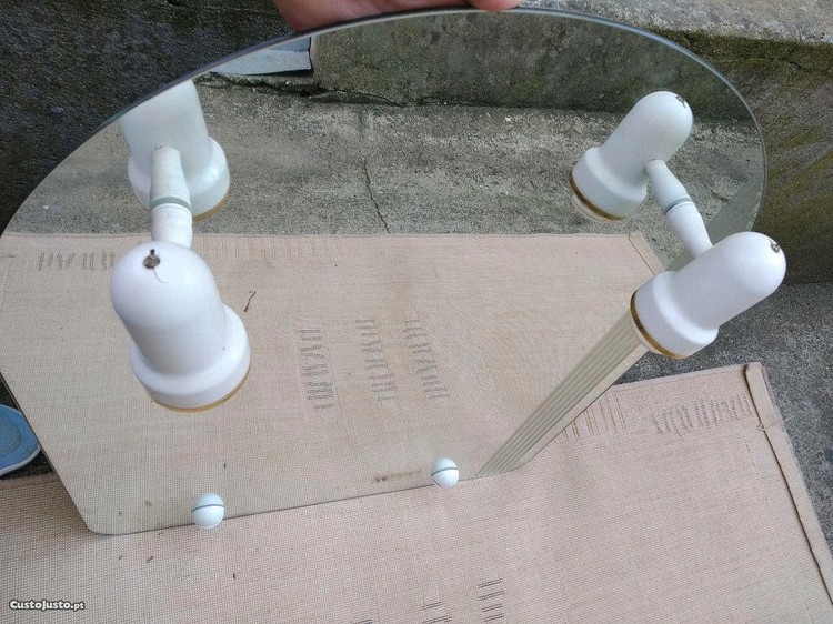 Espelho com duas lâmpadas e apoio para colocar uma prateleira.