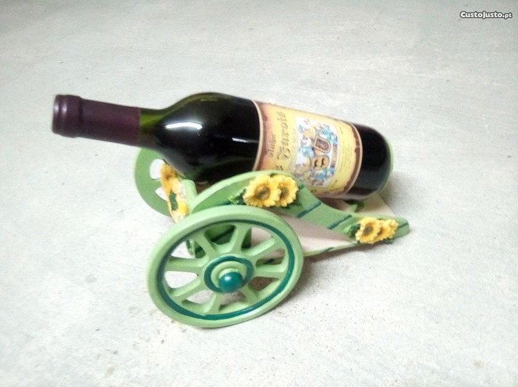 Um balde em inox com capacidade de 4kg e pinça para gelo e/ou para refrescar garrafas. Um porta garrafa muito bonito em madeira e louça. é artesanal, as rodas giram e fica engraçado numa mesa.